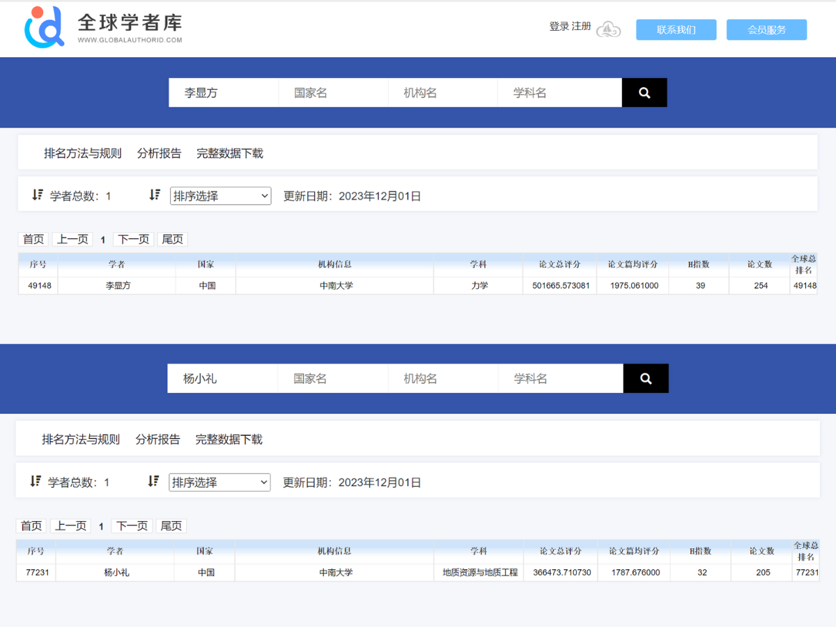 近日,全球学者库网站公布了“2023全球学者学术影响力排名 (终身学术影响力榜)”, 国内共有8029名学者入选,必赢766net手机版李显方教授、杨小礼教授分别入选力学学科、地质资源与地质...