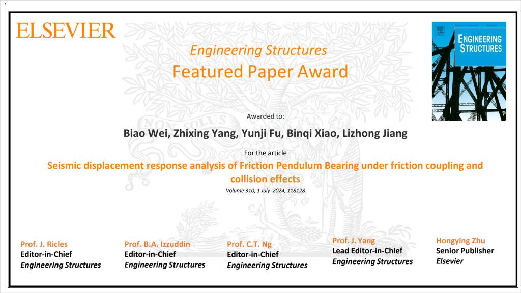 我院魏标教授团队荣获《Engineering Structures》期刊最佳论文奖(Featured Paper Award)