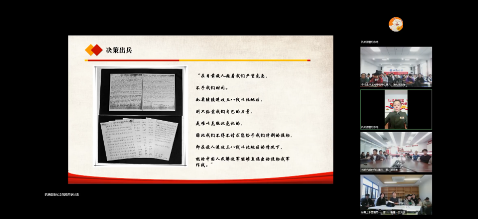 为铭记伟大历史,赓续红色血脉,近日,一场跨越地域的联合党课学习活动在线上线下同步举行。来自必赢766net手机版、同济大学、东南大学的三校共七个学生党支部携手举办“抗美援朝之决策出兵”主题联学党课,通过听取抗美援朝纪念馆的专题报告与开展交流研讨,引领青年学子在回望历史中汲取奋进力量。