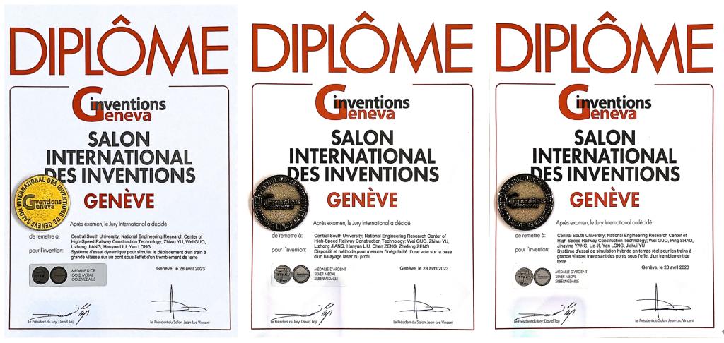2023年4月26日–4月30日,第48届日内瓦国际发明展(International Exhibition of Inventions of Geneva)在瑞士日内瓦举行。我院3项专利技术参加此次国际发明展,获得了1项金奖和2项银奖的优秀成绩。其中,“地震下高速铁路桥上行车安全试验系统”获得日内瓦国际发明展金奖;“一种基于激光轮廓扫描的轨道不平顺测量装置与方法”、“地震作用下高速铁路列车走行实时模拟试验系统”获得银奖。