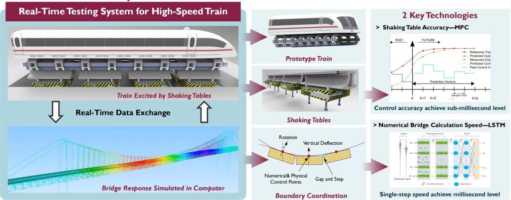 发明简介:我国高铁路网多穿越地震区,保障地震下桥上行车安全是高速铁路建设和可持续发展的重大需求。因地震突发性、破坏性和不可预见性,世界范围内高铁震害记录缺乏,没有震致列车脱轨室内试验方法和科学试验实证。本发明的地震下高速铁路桥上行车安全试验技术及系统,是国际首创复现地震下桥上行车性能和列车脱轨极端状态的试验装备,完成了500余次地震下桥上行车试验,为揭示灾变机理、提出控制指标、研发减隔震产品以及修订国家与行业标准提供了关键试验平台。该专利技术已实施,所研制的大型科学仪器总投资6000余万,获得2022年度中国专利优秀奖,所研发和验证成果支撑了国家技术发明二等奖、湖南省科技进步一等奖等重要奖励。
