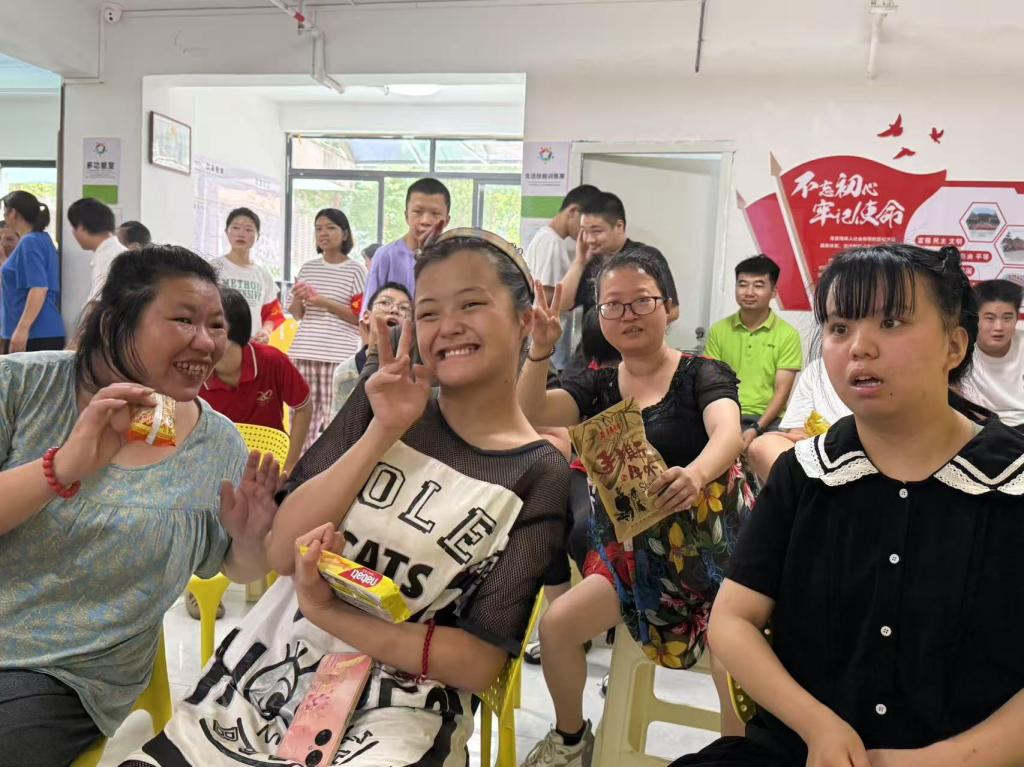 而观众们的反应,又再次温暖了大家的心。当有人表演时,台下的每一个人都在为他们呐喊,为他们欢呼,毫不吝啬自己的夸赞。笑笑(化名)跳古典舞蹈时,观众们都在默默欣赏着笑笑的每一个动作,此刻不再像先前那样热闹了,似乎都怕打扰到笑笑舒展的舞蹈动作。老师和志愿者们都在拿手机不停的记录着此刻的美好。当主持人宣布即将进行下一个环节时,老师用手比着“1”,原来是老师不舍这一环节早早结束,想再来一轮,附加环节在“花”传到指定的一位学员时停下,这位平日害羞、较少主动参与的学员,在老师的特意安排下获得了展示自我的机会。